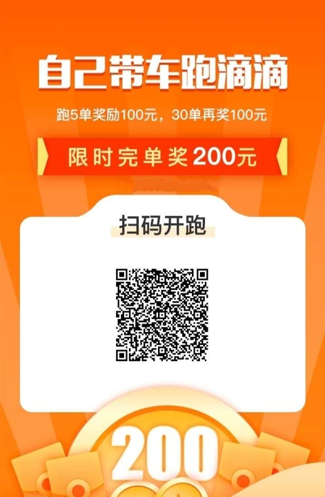 为解决打车人多,司机少的问题,现滴滴诚邀带车司机1000名,400元奖金等你拿,加油五折优惠。(仅限扫码注册用户)要求:之前未注册过滴滴司机的新用户。流程:扫码注册-下载滴滴车主-登录跑单-坐等奖励到账,(驾驶本和行车本不是同一人也可以。)有问题联系客服威信:*****6841