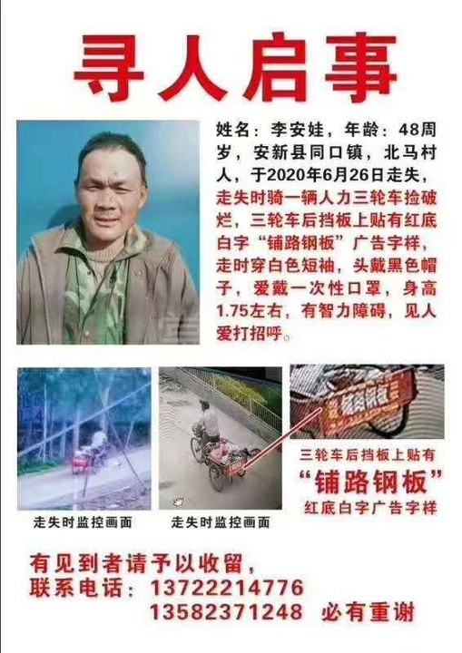 寻人启事姓名:李安娃,年龄:48周岁,安新县同口镇,北马村人,于2020年6月26日...