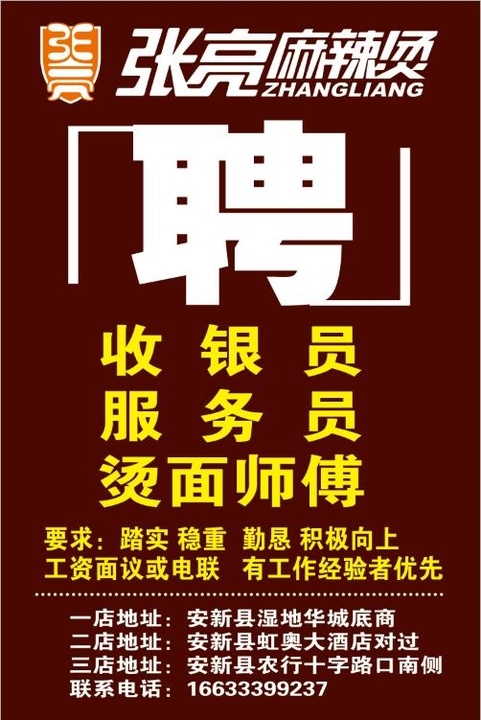 张亮麻辣烫安新店招聘收银员,服务员,烫面师傅若干名,待遇优厚,致电或者进店详谈,联系电话:*****9237