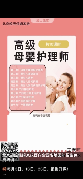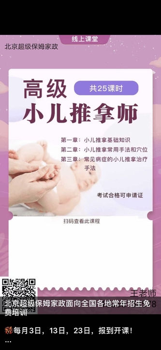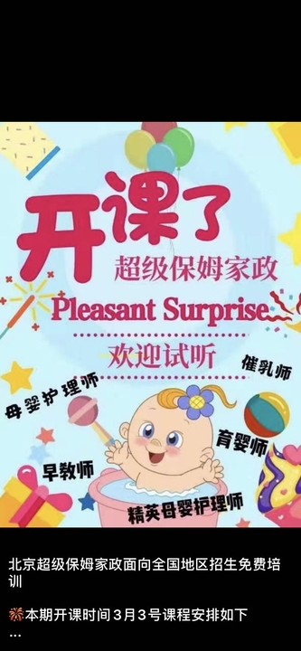 培训内容:高级母婴护理,育儿早教,催乳推拿产后康复,营养师,按摩理疗师,老人护理师,家政服务员,家政讲师,家政经纪人,加盟商等!