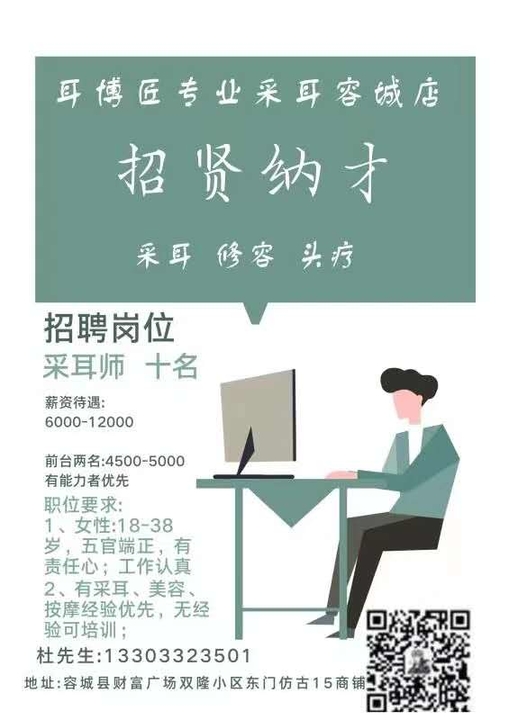 诚聘釆耳师,生熟手即可,免费培训,会釆耳,按摩,美容,头疗,或者团队优先