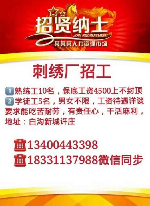 招电脑刺绣人员,熟练工优先,可以合作,要求能吃苦耐劳,有责任心,干活利落,生手每月四千,地址白沟,电话*****3398
