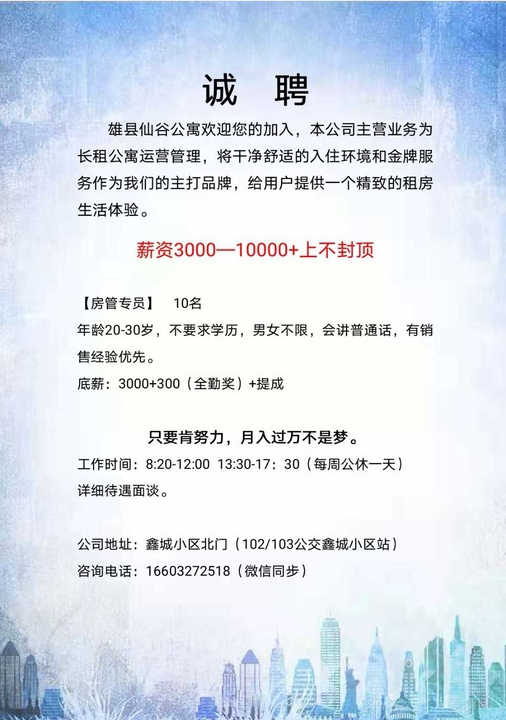 对房屋公寓进行长,短租业务,不要求学历,男女不限,会讲普通话,有销售经验者优先,月入过万不是梦。